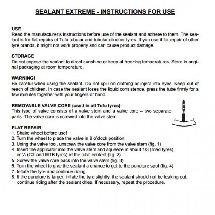 Prodotto estremamente efficace per riparare le forature di tutte le gomme TUFO. Può essere usato SOLO DOPO aver subito una foratura. L’applicazione avviene tramite lo stelo o l’apertura della valvolina. Accessori: attrezzo per la valvola
