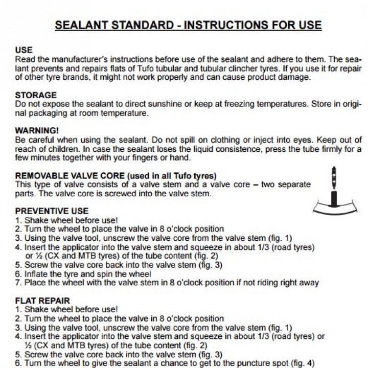 Prodotto per riparare le forature di tutte le gomme TUFO. Può essere usato dopo aver subito la foratura e anche preventivamente, quando applicato all’interno della gomma prima del suo utilizzo. Quando avviene una foratura, il sigillante chiude il foro in modo che il corridore non si accorga nemmeno dell’accaduto. Aumenta notevolmente la sicurezza, poichè non avviene una rapida perdita d’aria e di conseguenza il corridore non perde la sua stabilità. L‘applicazione avviene tramite lo stelo e l’apertura della valvolina. Accessori: attrezzo per la valvola
